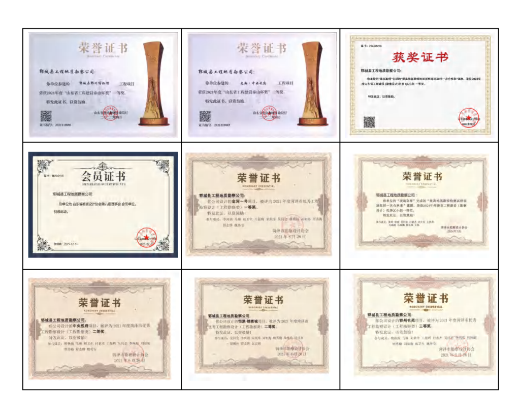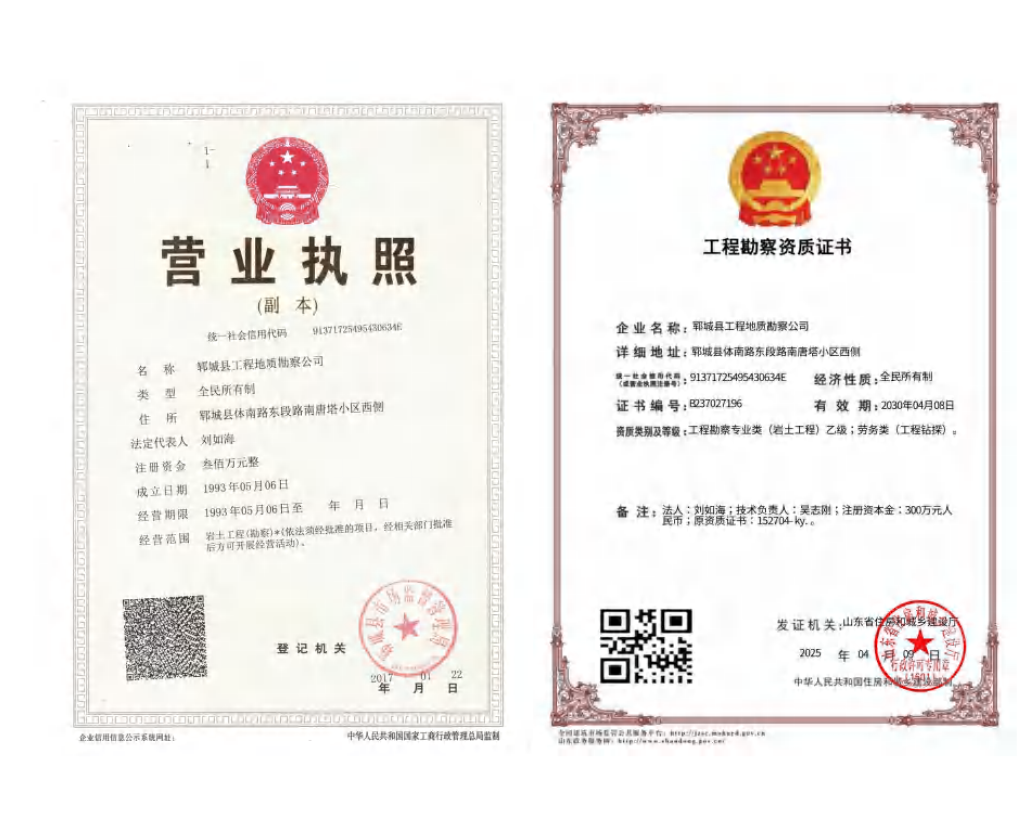 lunbo_1深耕岩土 · 筑基未来专注工程地质勘察服务三十年深耕岩土筑基未来专注工程地质勘察三十年lunbo_2专业施工团队lunbo_3高效完成施工lunbo_4精准满足需求 关于我们 郓城县工程地质勘察公司 于1993年成立,从事岩土工程勘察服务三十余年,公司位于郓城县胜利街与文苑路路口东50m,联系电话:0530-6513456。 主营业务岩土工程与工程地质勘察、设计;水文地质勘察、工程测绘、沉降观测、基坑支护设计与施工、基坑降水施工等资质,配备有土工试验室。 专业人员现有国家注册土木(岩土)工程师2人,国家一级注册建造师、国家二级注册建造师4人;高级工程师5人,中级职称人员7名。 专业设备现有钻探设备、GPS测量设备、静力触探仪、波速测试仪等外业勘察设备,土工试验室配备有三轴固结仪、常规及高压固结仪、剪切仪、渗透仪等设备。 企业荣誉 资质证书 企业荣誉 代表工程 查看更多 郓城县博物馆 国家二级博物馆,总建筑面积2.2万平方米,将唐塔元素与现代风貌相结合,展现了郓城县当地文化特色,成为地标性建筑。 德坤华府 总建筑面积约32万平方米,项目共33栋,11、18层。 项目商业与住宅之间巧妙划分,避免居住小区内部和外部商业流线交叉,高效实现了人车分流。 鹏瑞郓州1号 项目总占地面积约10万平方米,建筑面积约32万平方米,由30栋小高层、高层产品组成,繁华中打造一处“鲜氧胜地”。 资源配置 查看更多